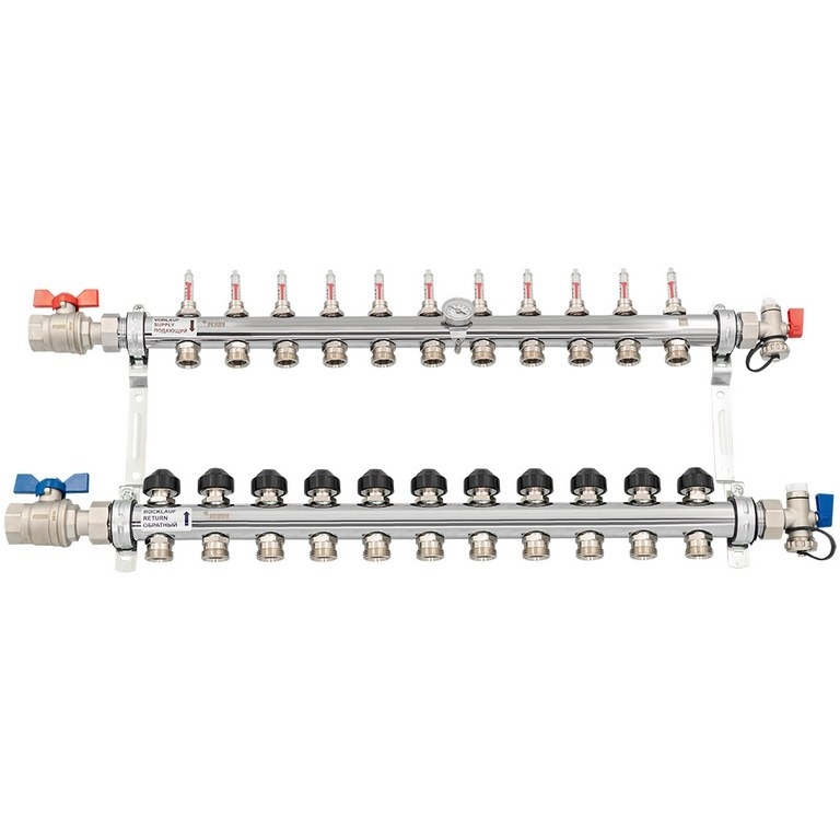 Коллектор для тёплого пола с расходомерами РЕХАУ HKV-D изготавливается из нержавеющей стали и предназначен для систем 2-контурного напольного отопления. Снабжён вентильными