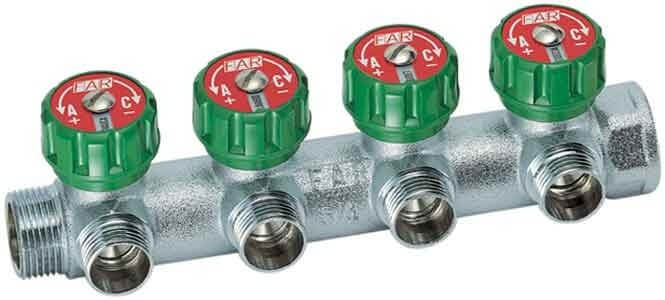 Коллектор FAR со встроенными регулирующими  вентилями устанавливается в систему отопления или водоснабжения. Коллектор оснащен двухсторонним диском (красно/синий) и диском с обозначениями сантехнических точек (туалет, стиральная машина, раковина и т.д.). С помощью  регулирующих ручек можно оперативно закрыть/открыть поток и  точно регулировать расход по каждому потребителю. Надежность работы клапана обеспечивается EPDM-уплотнениями. Отводы с трубной резьбой под установку фитингов с плоским уплотнением. Латунный коллектор FAR имеет хромированное покрытие, которое увеличивает стойкость к коррозии и минимизирует воздействия внешней среды.