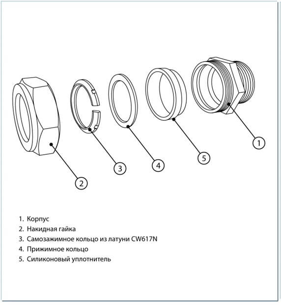 Это позволяет осуществить монтаж быстро и без риска рассыпать части фитинга и потерять его детали.