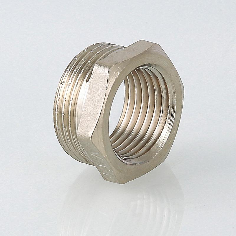 (VTr.581.N) Футорка – фитинг, обеспечивающий соединение труб разного типоразмера, подключение трубопровода к элементу системы с большим диаметром присоединительного патрубка, ремонт (замену) поврежденной резьбы. Изделие выполнено из латуни марки CW617N, никелировано. Резьба – наружная/внутренняя, по типу – трубная цилиндрическая, совместимая с наружной конической (ГОСТ 6211). Шестигранная головка футорки служит ее вкручиванию гаечным ключом. Максимальное рабочее давление использования соединителя зависит от температуры среды: 250 °С – 2,7/1,7 бар, 200 – 3,0/2,7, 120 – 40/25 (до/более 1”).