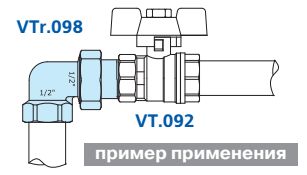 VTr.098.N) Разъемный угловой сгон, соединение компонентов которого осуществляется накидной гайкой (угловая американка). Материал фитинга – сантехническая латунь CW617N. Детали никелированы.