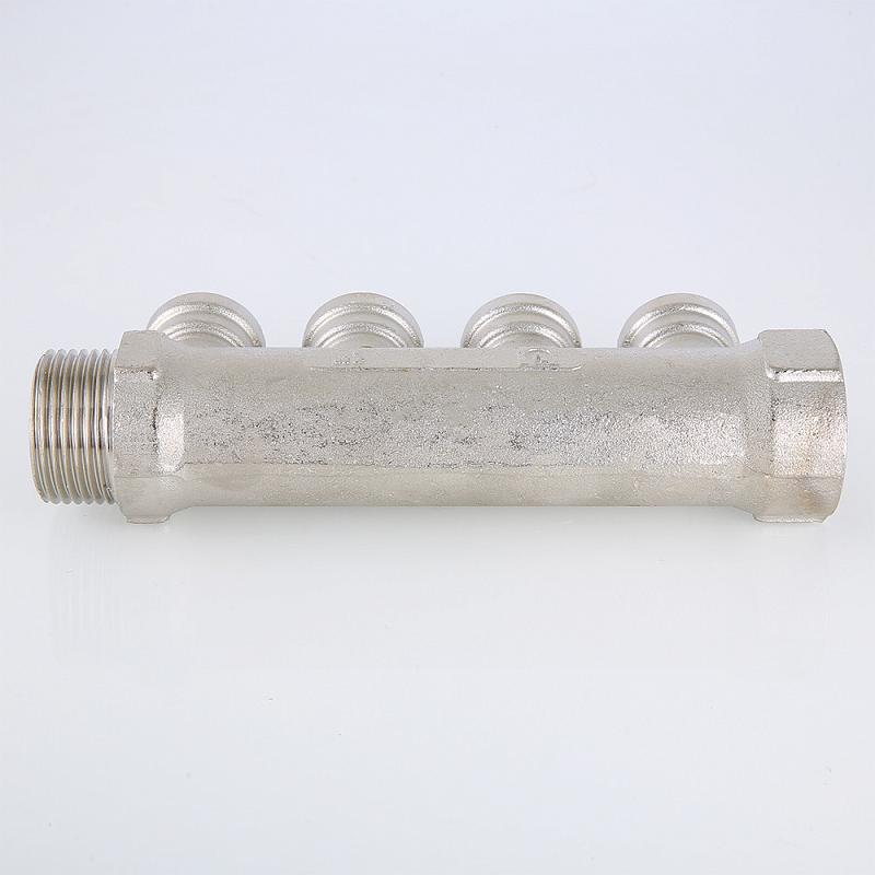 (VTc.550.N) Латунный никелированный коллектор на 2, 3 или 4 выхода диаметром 1/2" с внутренней резьбой. Диаметр коллектора – 3/4 или 1", резьба – внутренняя/наружная. Рабочая температура теплоносителя – до 130 °С, давление – до 16 бар. Применяется для распределения потоков жидкостей в контурах теплого пола, радиаторного отопления, холодного и горячего водоснабжения.